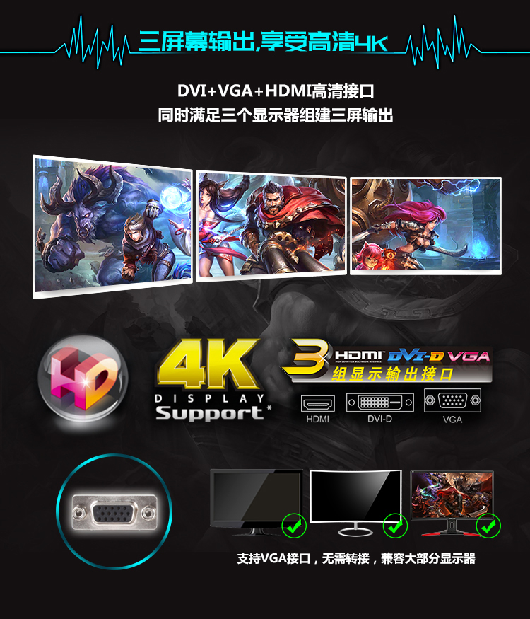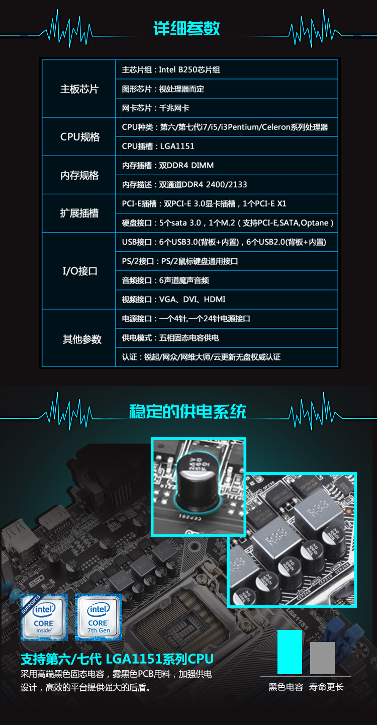 VGA+DVI+HDMI接口,雙顯卡插槽,支持Optane/Nvme/SATA的M.2插槽,數(shù)模分割線,音頻電容,中空散熱片