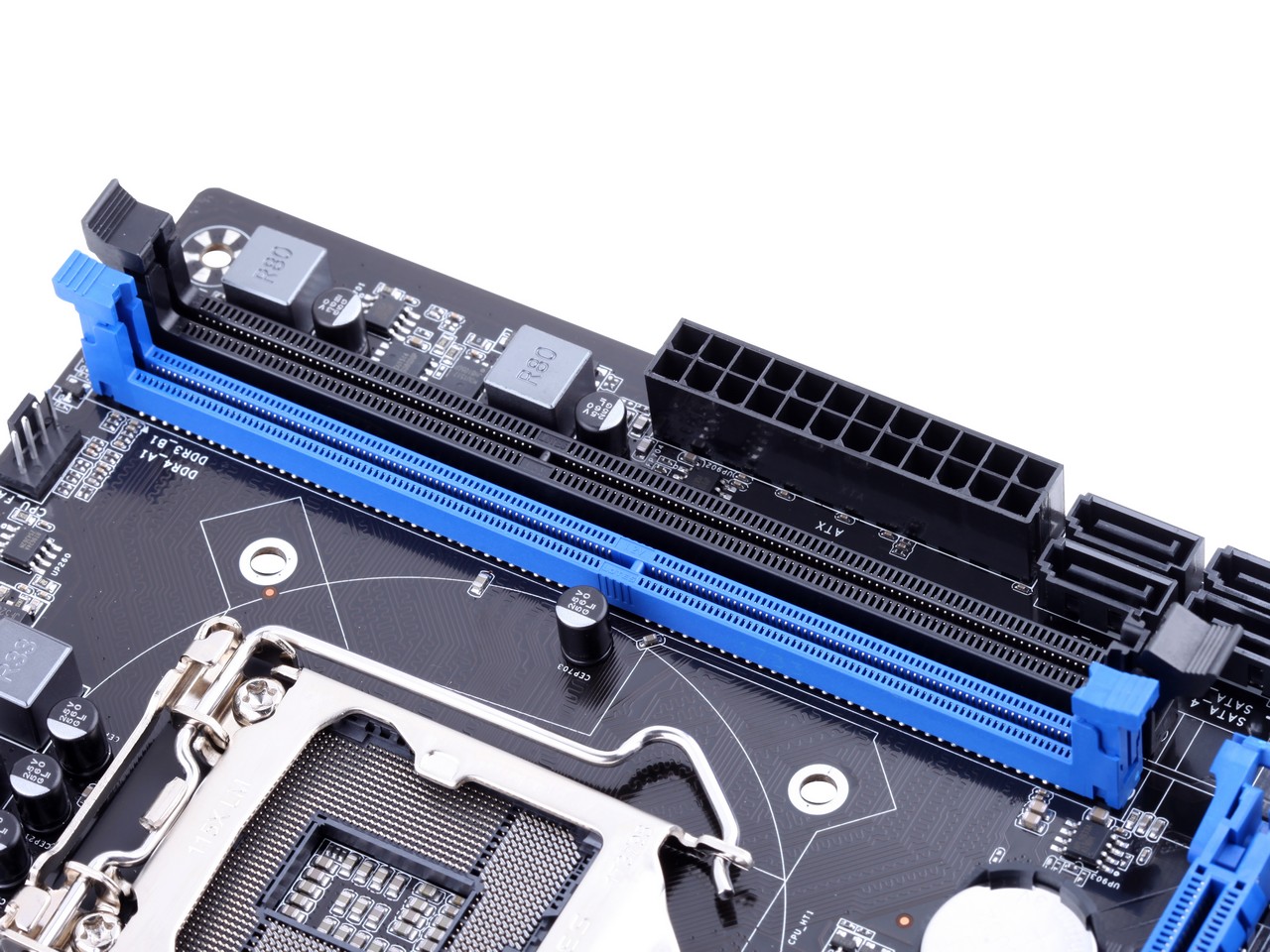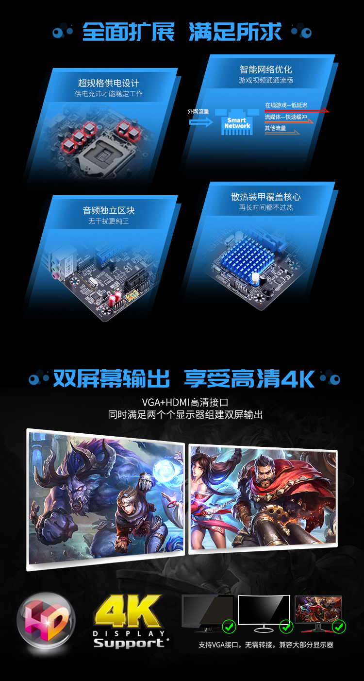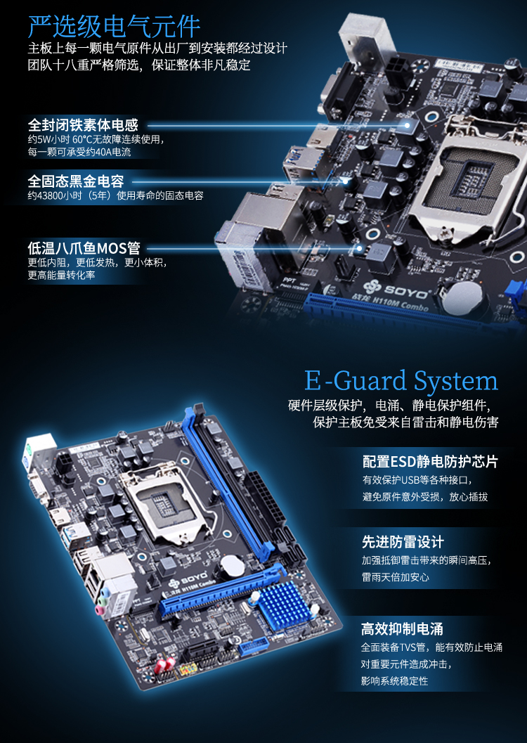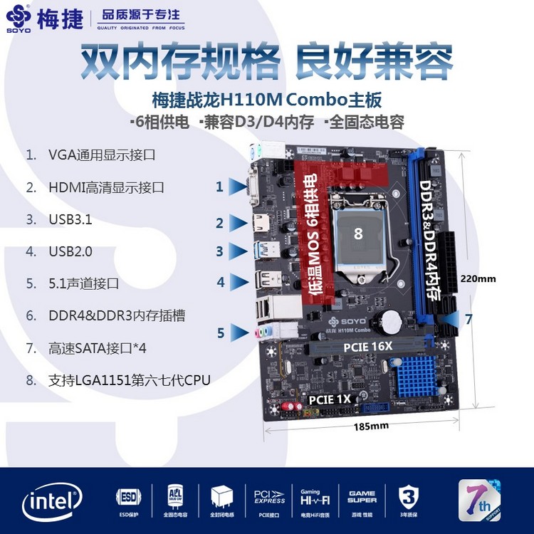 扎實(shí)供電,支持DDR3/DDR4內(nèi)存(需插入對(duì)應(yīng)內(nèi)存插槽,不能混插與同時(shí)插),音頻分割線,音頻電容,SATA3.0,USB3.0