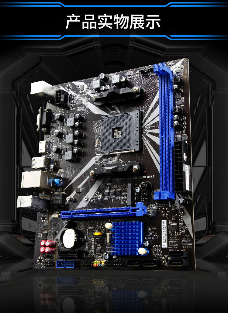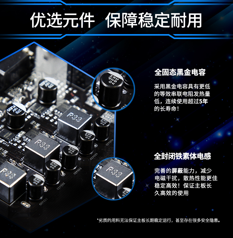 1x M.2高速接口,1顯卡插槽,2條DDR4內(nèi)存槽,五重音頻優(yōu)化,五相供電,整版ESD防護(hù),中空散熱片