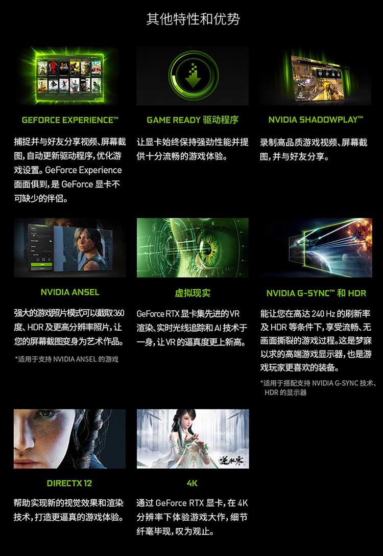 支持Simultaneous Multi-ProjectionVR圖像矯正技術(shù),VRWorks Audio虛擬現(xiàn)實音頻技術(shù),Ansel截圖功能,PhysX物理加速技術(shù),NVIDIA CUDA,PureVideo HD高清硬件解碼,動態(tài)超級分辨率,MFAA,GeForce 3D Vision,GameWorks™,G-Sync™-Ready,GameStream™-Ready,GeForce ShadowPlay™,GPU Boost™