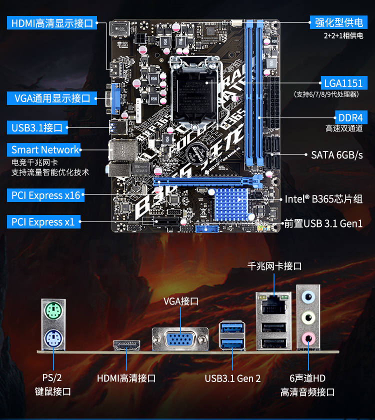 IO接口方面,狂龍B365M-VH的配置中規(guī)中矩,HDMI+VGA的視頻輸出接口,支持雙屏顯示輸出。千兆網(wǎng)卡和USB3.1等基本也是標(biāo)配的接口了,同時(shí)還保留了PS/2鍵鼠接口,這對(duì)于使用老式鍵鼠的用戶來(lái)說(shuō),可謂利好。