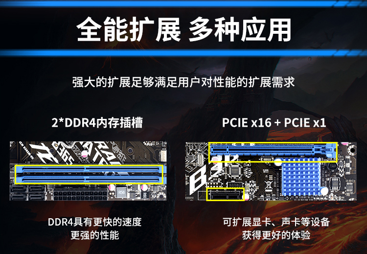 插槽方面,高速雙通道DDR4內(nèi)存插槽和PCIE x16 + PCIE x1插槽,大大增加了后續(xù)的升級(jí)和可擴(kuò)展性,滿足不同玩家的需求。