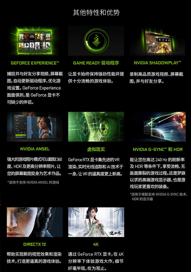 支持Simultaneous Multi-ProjectionVR圖像矯正技術(shù),VRWorks Audio虛擬現(xiàn)實(shí)音頻技術(shù),Ansel截圖功能,PhysX物理加速技術(shù),NVIDIA CUDA,PureVideo HD高清硬件解碼,動(dòng)態(tài)超級(jí)分辨率,MFAA,GeForce 3D Vision,GameWorks™,G-Sync™-Ready,GameStream™-Ready,GeForce ShadowPlay™,GPU Boost™