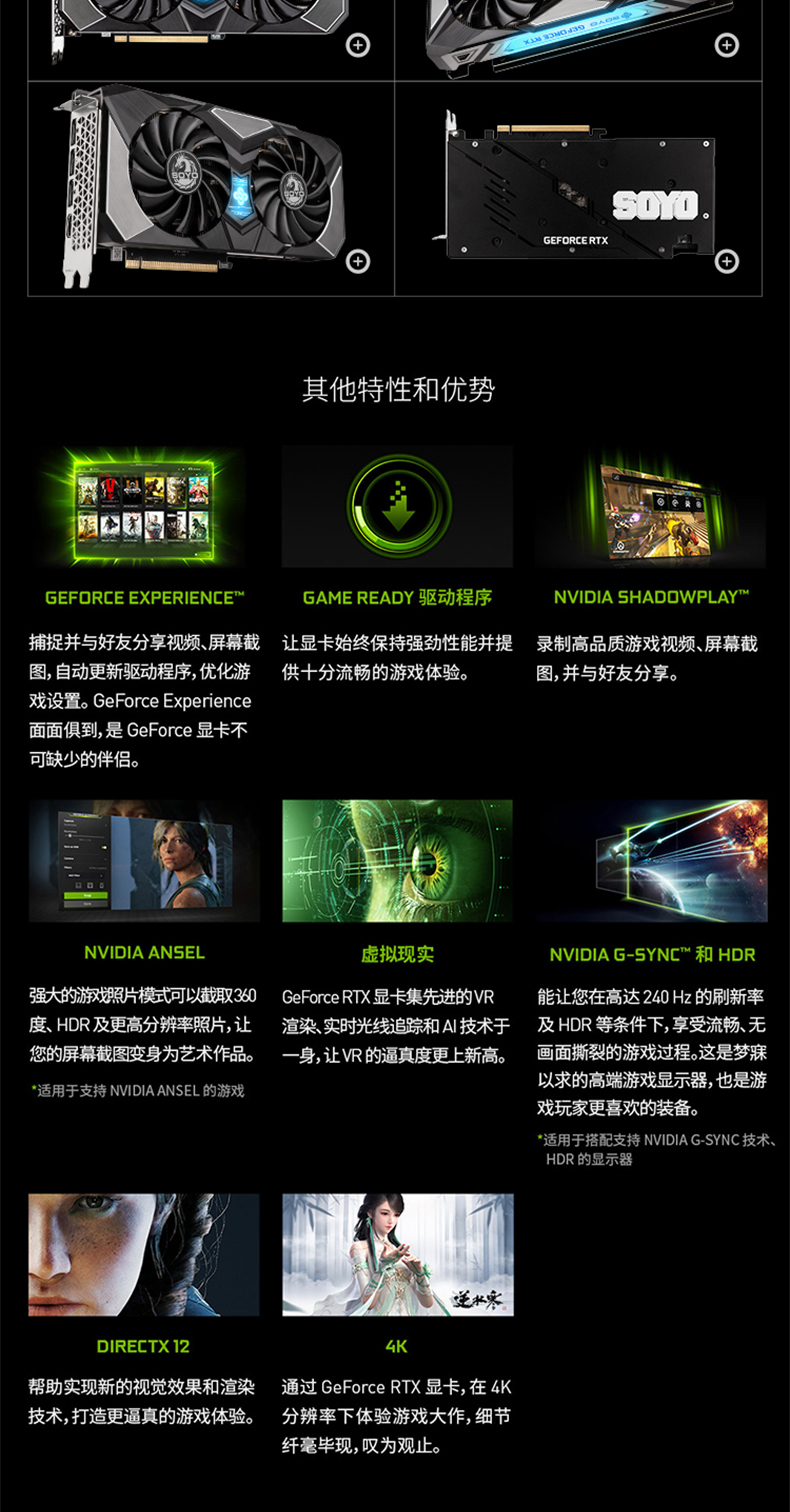 支持Simultaneous Multi-ProjectionVR圖像矯正技術(shù),VRWorks Audio虛擬現(xiàn)實音頻技術(shù),Ansel截圖功能,PhysX物理加速技術(shù),NVIDIA CUDA,NVIDIA REFLEX,PureVideo HD高清硬件解碼,動態(tài)超級分辨率,MFAA,GeForce 3D Vision,GameWorks™,G-Sync™-Ready,GameStream™-Ready,GeForce ShadowPlay™,GPU Boost™