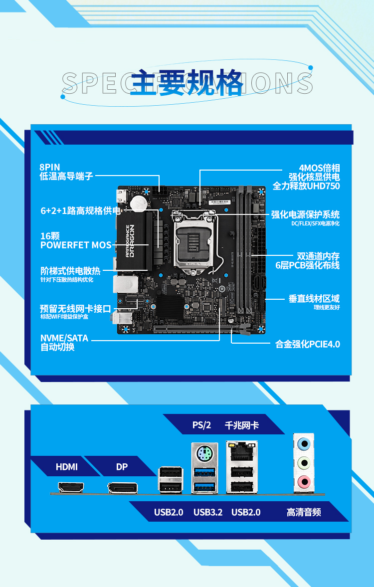 - 2×USB3.2 Gen1;4×USB2.0接口